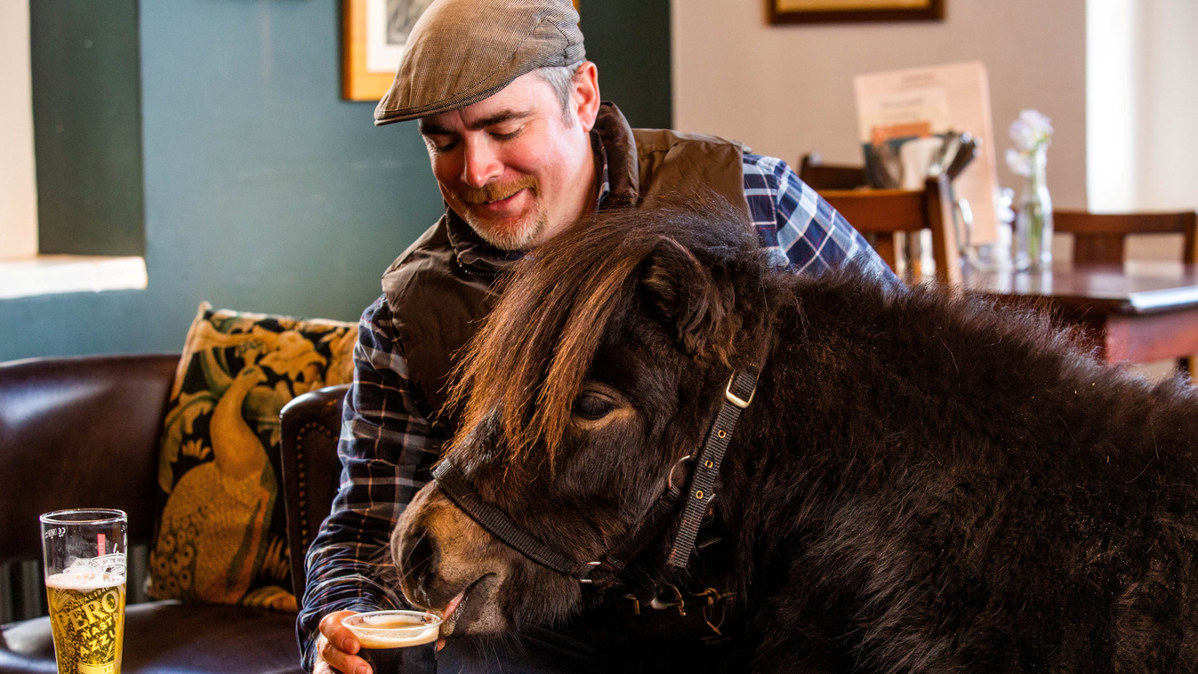 Patrick, a shetlandi póni megszokott látvány a Devonban található The Drum Inn nevű kocsmában.