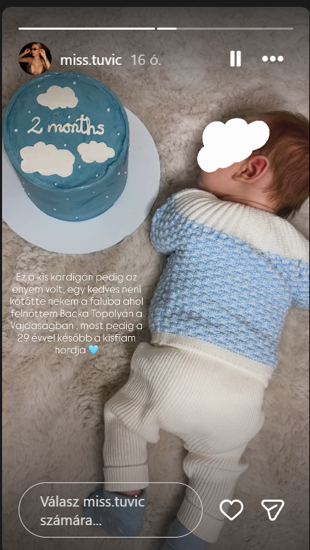 Csak úgy repül az idő: Aleksandra a minap boldogan osztott meg néhány fotót a kisfiáról a közösségi oldalán, aki immár elmúlt két hónapos. A Kőgazdag fiatal a 24 óráig elérhető Instagram- történetében mutatta meg a kis Mattheót, egy torta társaságában, amelyen a két hónap felirat szerepel, mialatt azt is elárulta, a kötött, kék kardigánnak, amit a kicsi visel, története van.