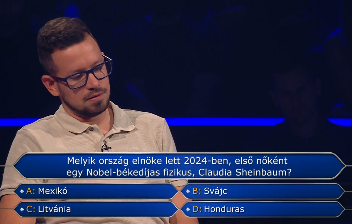 A 15 milliós kérdés azoknak ment volna könnyebben, akiket kifejezetten érdekel a külpolitika, azon belül is Latin-Amerika. Arra kellett választ adni, mely ország elnöke lett első nőként 2024-ben a Nobel-díjas Claudia Sheinbaum.