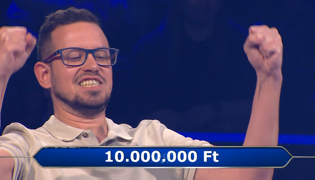 A 13. kérdés nem ment, de egyáltalán nem babonás, megszállottan racionalista. Nincs szerencseszáma, teljesen elégedett a nyeremény összegével is. A témakörök közül a bulvárral nagy bajban lett volna, a sportkérdéseket sem várta, a könnyűzene témakörében sem mozog otthonosan. Focis kérdést kapott, ekkor viszont a közönség segítette ki a TV2 műsorának új milliomosát.