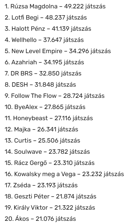 2025-ben ünnepelte a magyar rádiózás a 100 éves évfordulóját. A mérések szerint a 15 évesnél idősebb korosztályban a rádióhallgatás továbbra is népszerű, naponta 5,7 millióan, hetente pedig 7,6 millióan hallgatnak rádiót. Tavaly Rúzsa Magdi dalait hallhattuk legtöbbet a rádióban, közel 50 ezerszer: de kik vannak még a top 20-ban?