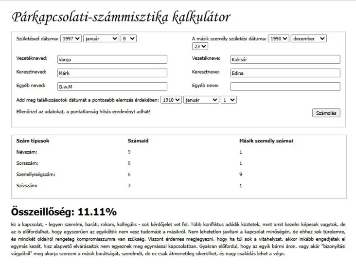 Egy párkapcsolati számmisztika-kalkulátor szerint ugyanis alig 11 százalékos az összeillőségük…
