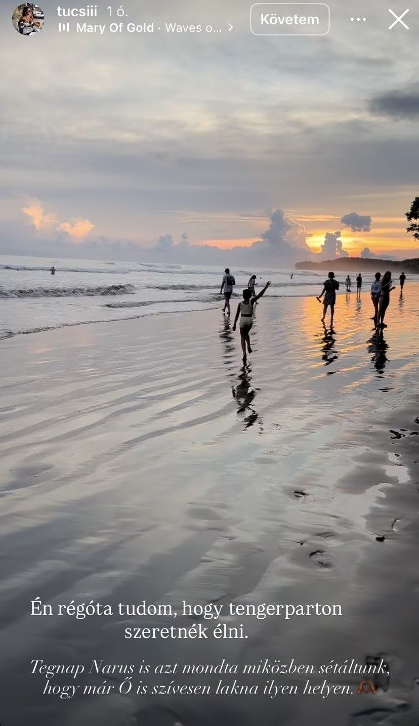 – írta Tücsi, majd azzal folytatta, hogy családjuk legkisebb tagja is hasonlóan van ezzel: „Tegnap Narus is azt mondta miközben sétáltunk, hogy már Ő is szívesen lakna ilyen helyen” – így kiderült, hogy Tücsi kislánya is belemenne, hogy a család összeszedje sátorfáját, és egy gyönyörű tengerközeli helyen éljenek.